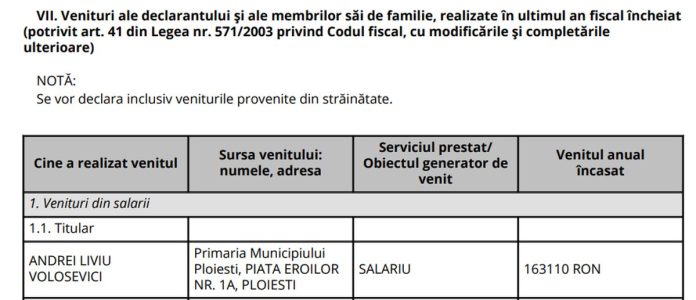 Andrei Volosevici încasează de la primărie un salariu de 13.592 lei media lunară. În afară de asta, tot primăria îi pune la dispoziție din banii noștri mașină, șofer, telefon, asigurare medicală premium, tichete de vacanță, diurne, deconturi etc.