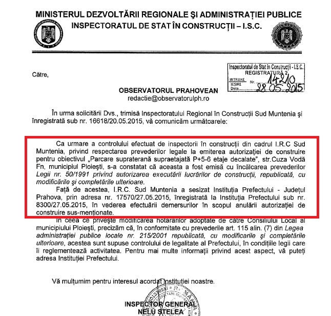 La solicitarea locatarilor (toată stima pentru cum și-au apărat drepturile), Inspectoratul de Stat în Construcții face un control care scoate la lumină ilegalitatea autorizației de construire eliberată de Primăria Ploiești pentru parcarea respectivă.