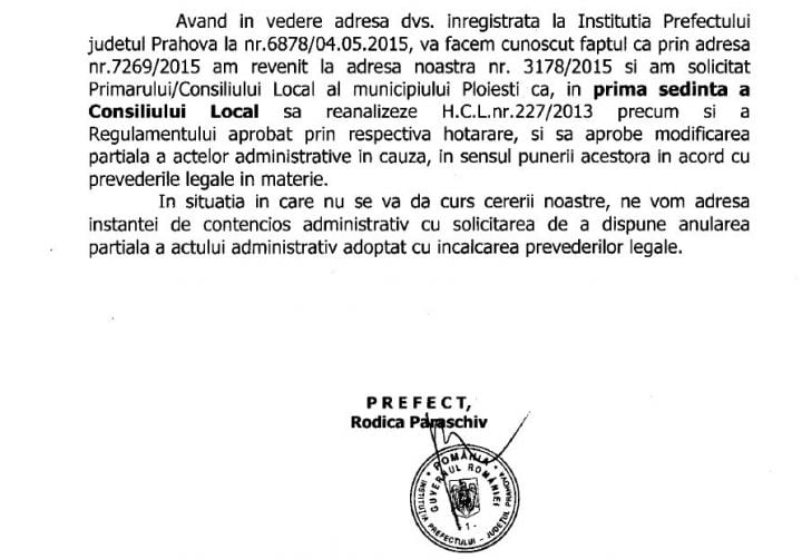 Potrivit documentului de mai jos, transmis la solicitarea observatorulph.ro, conducerea ISC susține că a solicitat Prefecturii Prahova atacarea în contencios a hotărârii Consiliului Local Ploiești în baza căreia s-a construit parcarea din mijlocul străzii.