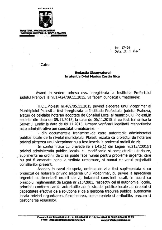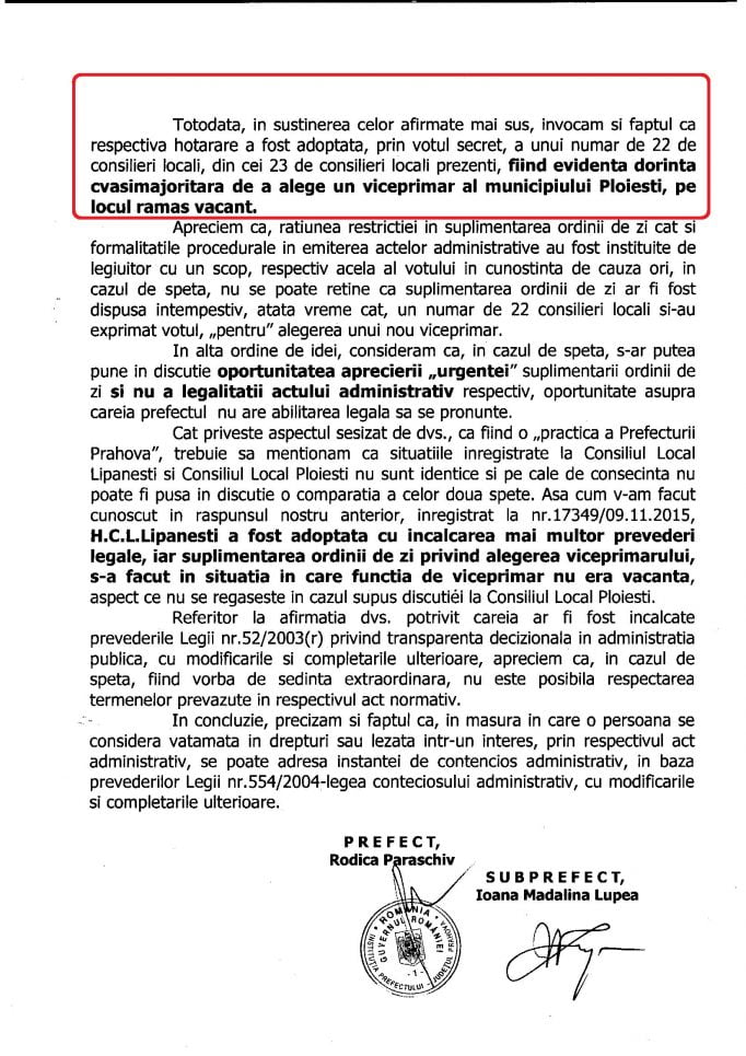 Din răspunsul Prefecturii Prahova de mai jos reiese că autoritățile locale sunt autonome și că alegerea viceprimarului cu 22 din 23 de voturi (n.r. inclusiv de către consilierii PNL) este un motiv în plus pentru care nu va ataca în contencios hotărârea respectiv.